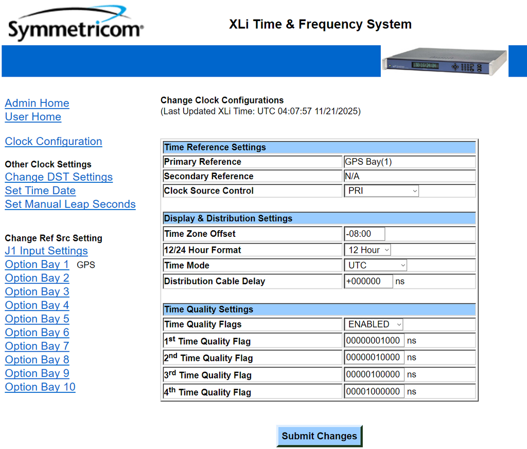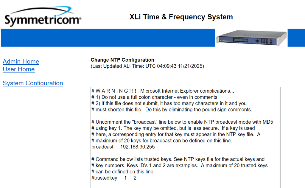 Seamless Integration The XLi seamlessly integrates into a network centric environment. The 10/100 Base-T interface is standard. Remote management is facilitated with the intuitive HTML web based interface as well as SNMP with an enterprise MIB. Command line interface is also supported via Telnet or the RS-232/422 serial port. The XLi can function as a Stratum 1 NTP server with addition of the NTS option.
