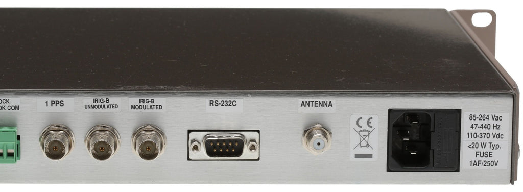 Here's a lightly used GPS disciplined master clock unit with IRIG-B, Serial and 1 PPS outputs as well as an impressive and hard-to-find optional large red LED time display. The oscillator is a TCXO type. The LCD display does not have the optional backlight installed. The unit has been tested to confirm that it works as it should. The unit comes with a basic antenna to allow you to test the unit immediately upon receipt. For a permanent installation an outdoor antenna with a full view of the sky will be required. The antenna voltage is 5V so almost any professional GPS antenna will suffice. Note that the red LED digits in the display have some difference in illumination levels - see photos. This doesn't affect the functionality or legibility of the clock. The unit has Option 28 installed - to measure AC line frequency via the System Reference BNC connector at the rear. I don't have the special cable that connects to this jack so I have not tested that function. The option does show up in the front panel config menus.