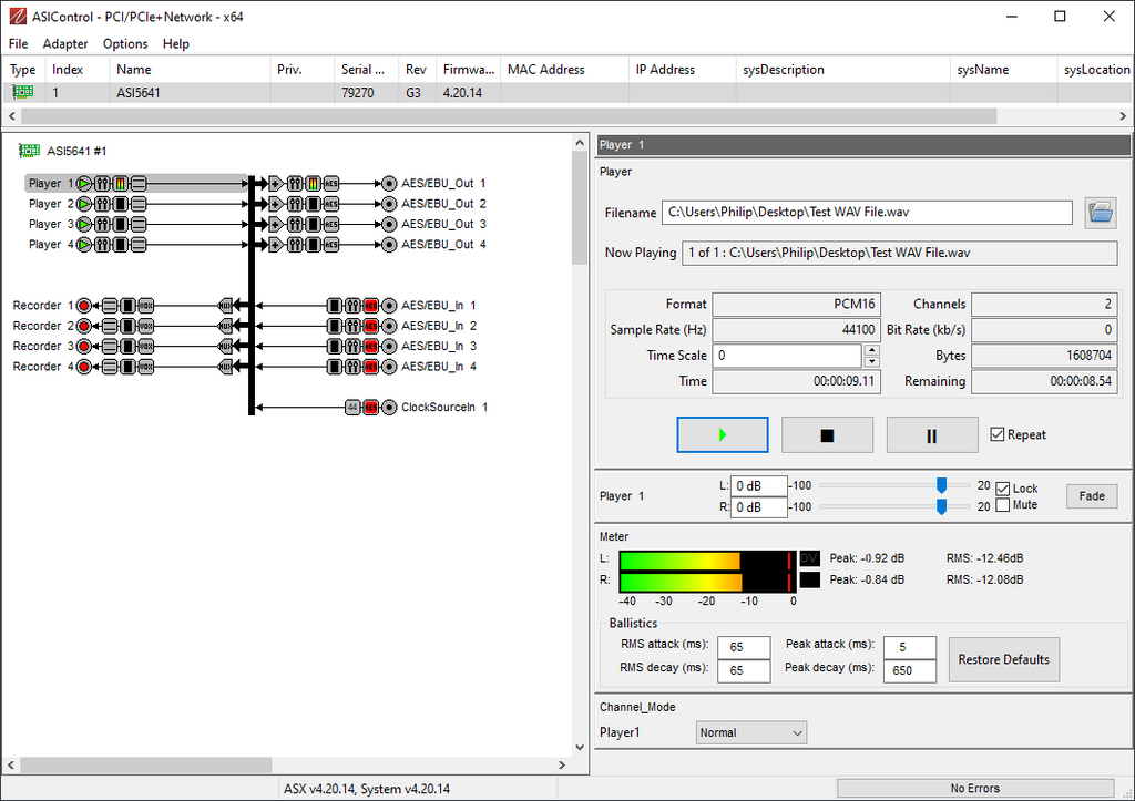 Providing 12 stereo play streams that are mixed to 4 balanced stereo outputs and 8 record streams fed from four balanced stereo inputs, the ASI564x family features AudioScience’s unique “anything to anywhere" routing and mixing.