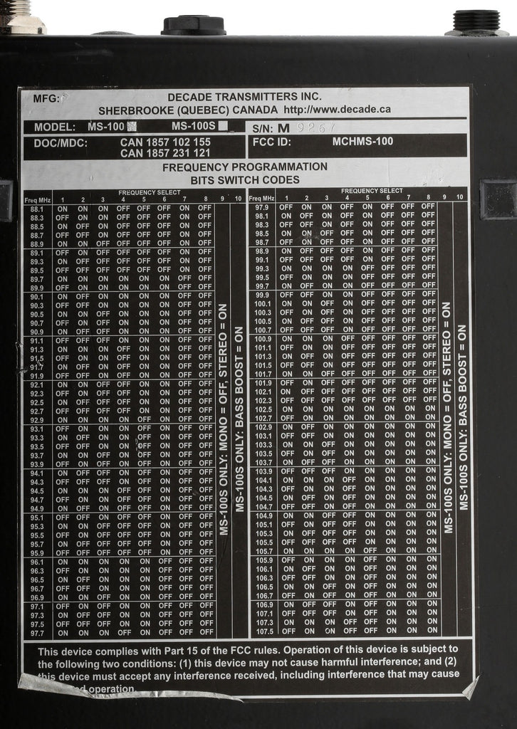 • The MS-100 features Decade's latest technology innovation called DAFP technology (Direct Access Frequency Programming). This new digital technology allows the end user to program the frequency without any manual tuning inside the unit.